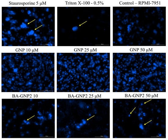 Nuclear staining using DAPI in RPMI-7951 cells after treatment with GNP (diluted to match the same gold content as for BA-loaded NPs at 10, 25 and 50 μΜ) and BA-GNP treatment (10; 25 and 50 μΜ) for 24 h. The pictures were captured 24 h post-treatment. Staurosporine solution (5 μM) and Triton X-100 solution (0.5%) were used as positive controls. The yellow arrows represent signs of apoptosis, such as nuclear shrinkage or nuclear fragmentation. The scale bar is 100 μM.