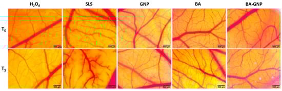 The in vivo Hen’s Egg Chorioallantoic Membrane Test (HET-CAM) assay determines a potential irritant effect on the vascular plexus of the chorioallantoic membrane []. The HET-CAM method was carried out in accordance with the ICCVAM recommendations published in Appendix G in November 2016 and adapted to our conditions [,,]. Thus, a volume of 300 μL of control or test solution was applied, and the modifications produced at the CAM level were monitored using stereomicroscopy (Discovery 8 Stereomicroscope, Zeiss, Göttingen, Germany), registering significant images (Axio CAM 105 color, Zeiss, Göttingen, Germany) before application and after 5 min of contact with the samples. All images were processed with Axio CAM 105 color, Zeiss, Göttingen, Germany, Gimp 2.8 (GNU Image Manipulation Program Development Team, v 2.10.24, https://www.gimp.org/; accessed on 2 September 2022), and ImageJ software (Image J Version 1.53k, https://imagej.nih.gov/ij/index.html; accessed on 2 September 2022, NIH, Bethesda, MD, USA). The negative control was distilled water, with the solvent control DMSO 0.5%, and the positive control was sodium lauryl sulfate (SLS) 0.5% aqueous solution. GNP and BA-GNP were tested at 1 μM concentrations. The produced reactions were observed for 5 min (300 s), and the time at which each reaction occurred was recorded in seconds. Finally, the following reactions were observed: hemorrhage—H (blood vessel bleeding), vascular lysis—L (disintegration of blood vessels), and coagulation—C. (intra- or extra-vascular protein denaturing). A variety of analysis methods can be used to determine the irritancy potential of test substances. An irritation score (IS) is a frequently employed method of analysis. An IS value was generated using the following formula: