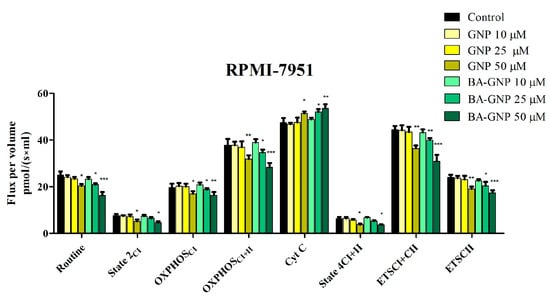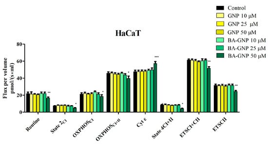 High respirometry studies (Oxygraph-2k Oroboros Instruments GmbH, Innsbruck, Austria) were employed to evaluate the mitochondrial respiratory function the at 37 °C. The assessment of permeabilized HaCaT and RPMI-7951 cells’ mitochondrial respiration was performed using a substrate uncoupler-inhibitor titration (SUIT) protocol, as previously described by Petruș et al. []. The cells were cultured in T75 culture flasks, washed with PBS, trypsinized, counted and resuspended (1 × 106/mL) in mitochondrial respiration medium (MIRO5: MgCl2 3 mM, EGTA 0.5 mM, taurine 20 mM, KH2PO4 10 mM, K-lactobionate 60 mM, D-sucrose 110 mM, HEPES 20 mM and BSA 1 g/L, pH 7.1). The tested compounds GNP (10, 25 and 50 μΜ) and BA-GNP (10, 25 and 50 μΜ) were added immediately after the cells in the chambers of the device.