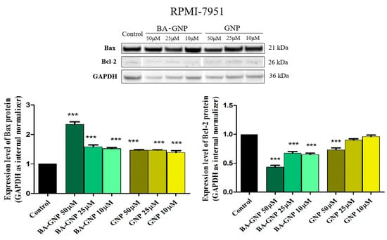 Mitochondria-dependent apoptosis is regulated by both pro-apoptotic Bcl-2 associated X (Bax) and anti-apoptotic B-cell lymphoma 2 (Bcl-2), two well-studied members of the large Bcl-2 family. Thus, to gain insights regarding the exact mechanism responsible for GNP and BA-GNP cytotoxic effects and, more precisely, to delineate the mitochondrial apoptotic pathway from the apoptotic pathway induced by DNA damage, Bax and Bcl-2 protein expression levels were determined using Western blot (Figure 13). The expression of Bax was upregulated upon treatment with both GNP and BA-GNP (Figure 13). Graphical analysis of Bax expression levels after loading control normalization showed that all concentrations of GNP and BA-GNP were able to significantly increase the protein expression vs. control, with the highest increase being observed upon RPMI-7951 treatment with BA-GNP in the highest concentration (50 μM). An inversely correlated dose-dependent response was observed in the case of anti-apoptotic Bcl-2 expression level. Treatment with increasing concentrations of BA-GNP led to a more drastic inhibition of Bcl-2 expression level; the strongest inhibition was once more observed for BA-GNP-treated cells (Figure 14). GNP alone was able to produce a similar effect on Bcl-2 protein expression only at 50 μM (Figure 14).