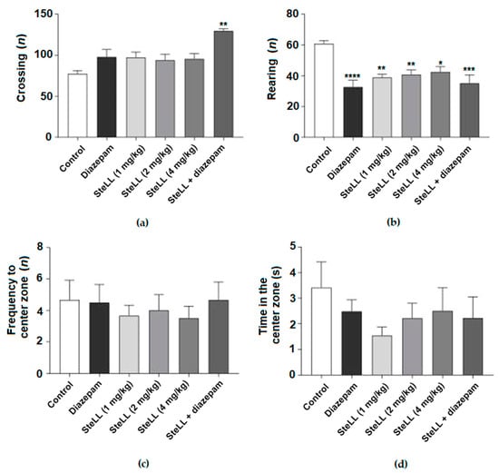 Effects of SteLL (1, 2, and 4 mg/kg) i.p. treatment in the open field test. Diazepam (1 mg/kg) was used as a positive control. Diazepam (0.5 mg/kg) plus SteLL (1 mg/kg) was used to evaluate the synergic effect of both compounds combined. (a) Total number of crossings. (b) Total number of rearings. (c) Frequency of the mice entering the center zone. (d) The overall duration of time mice spent in the center of the apparatus. Significant differences compared with the control group: (*) p < 0.05; (**) p < 0.001; (***) p < 0.0001; (****) p < 0.00001.