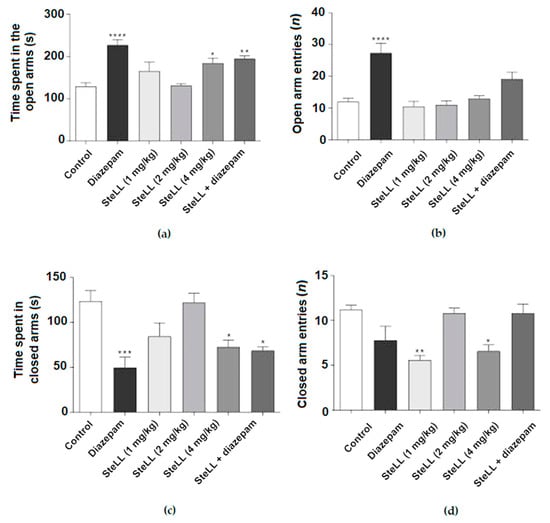 Anxiolytic-like behavior was evaluated using the EPM task []. Figure 2 shows the data on the evaluation of whether SteLL also promoted an anxiolytic effect in the EPM test. The treatments of mice with the highest dose of SteLL (4 mg/kg), diazepam (1 mg/kg), and SteLL (1 mg/kg) plus diazepam (0.5 mg/kg) significantly increased the time spent in the open arms compared to the control (Figure 2A; F = 10.42, p < 0.0001). Diazepam alone increased the number of entries into the open arms compared to the control (Figure 2B; F = 12.83, p < 0.0001). In addition, when analyzing the time spent by mice in the closed arm of the EPM, the data for diazepam (1 mg/kg), SteLL (4 mg/kg), and SteLL (1 mg/kg) plus diazepam (0.5 mg/kg) significantly differed from the control (Figure 2C; F = 8.109, p = 0.0001). Regarding the number of entries into the closed arms, a significant reduction was observed for treatments with SteLL at doses of 1 and 4 mg/kg compared to the control (Figure 2D; F = 7.491, p = 0.0002). Overall, the effect of SteLL was similar to the one observed in the group treated with the diazepam as positive control.