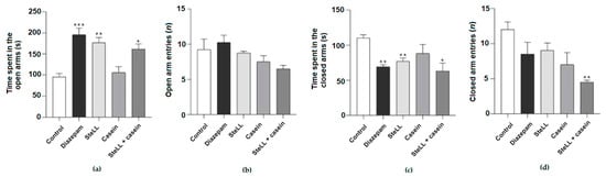 The incubation of the lectin with casein did not revert the anxiolytic effect of SteLL (4 mg/kg) in the elevated plus maze test. (a) Total time that mice spent in open arms. (b) The number of entries into the open arms. (c) Total time spent in closed arms. (d) The number of entries into the closed arms. (*) p < 0.05; (**) p < 0.001; (***) p < 0.0001 compared to control.