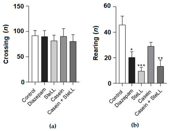 The incubation of the lectin with casein did not revert the anxiolytic effect of SteLL (4 mg/kg) in the open field test. (a) Total number of crossings. (b) Total number of rearings. (*) p < 0.05; (**) p < 0.001; (***) p < 0.0001 compared to control.