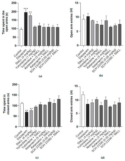 The anxiolytic-like effect of SteLL in the EPM was dependent on monoaminergic signaling. The pretreatment with the nonselective antagonist of the α2-adrenoceptor yohimbine 1 mg/kg, the 5-HT2A/2C serotonin receptor antagonist ketanserin 5 mg/kg, and the D1 dopamine receptor antagonist SCH 23390 0.05 mg/kg inhibited the effect of SteLL (4 mg/kg) on the time spent in the open (a) and closed (c) arms. No changes were observed in the number of entries in open (b) and closed (d) arms. The antagonists were administrated 15 min before SteLL administration. The experiments were conducted 15 min after SteLL administration. (**) p < 0.001; (***) p < 0.0001 compared to control.