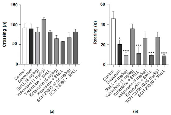 The blockage of the monoaminergic signaling did not alter the rearing responses of SteLL administration (4 mg/kg) on the OFT. The nonselective antagonist of the α2-adrenoceptor yohimbine 1 mg/kg, the 5-HT2A/2C serotonin receptor antagonist ketanserin 5 mg/kg, and the D1 dopamine receptor antagonist SCH 23390 0.05 mg/kg were evaluated. (a) There were no significant changes in the numbers of crossing among the groups. (b) SteLL 4 mg/kg decreased the number of rearings compared to the control even in animals pretreated with the antagonists. (*) p < 0.05; (**) p < 0.001; (***) p < 0.0001 compared to control.