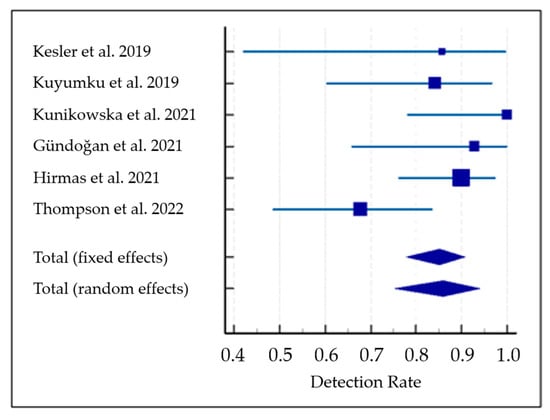 The authors performed a pooled analysis of the DR of PSMA-targeted PET, employing data from the included studies and taking into account the weight of each study using a random-effects statistical model as suggested by DerSimonian and Laird []. Furthermore, 95% confidence interval values (95% CI) were provided and subsequently displayed employing forest plots.
