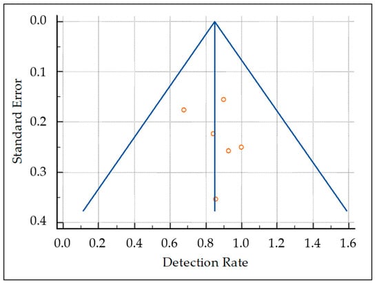 The pooled DR was 85.1% (95% confidence interval (95% CI): 77.9–90.7%) (Figure 3). A moderate statistical heterogeneity among the included studies was found as I2 was 56%. The funnel plot for publication bias assessment is illustrated in Figure 4. There is no significant asymmetry in the funnel plot, supporting the absence of substantial publication bias.