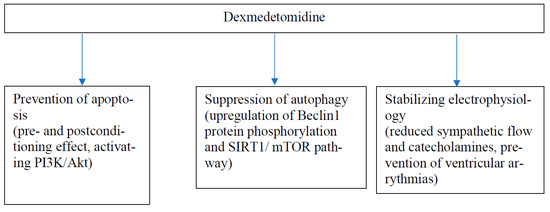 In vitro studies with isolated rabbit and rat hearts have shown that DEX inhibits voltage-gated Na channels (Nav1.5) and L-type calcium channels (IC-L) and opens large-conductance Ca2+-sensitive potassium (BKCa) channels, which are important mediators in myocardial conduction [32,33,34]. In addition, DEX has been shown to inhibit pacemaker cells in sinoatrial nodes and reduce ventricular arrythmias [35,36,37]. These effects were only partly or not all reversed by the α-2-adrenergic antagonist, yohimbine, suggesting a direct effect of DEX on the heart. α2-receptors are important in the development of myocardial hypertrophy but nodal tissue lacks α2-receptors [38,39]. In addition, Xia et al. have shown that DEX reduced bupivacaine-induced arrythmias and increased tolerance to bupivacaine-induced cardiac toxicity in rats [40]. There is a growing bulk of evidence supporting the cardiac and other organ protective effects of DEX as proven by several experimental models of ischemic injury and via multiple mechanisms [7]. Examples of the most recent findings [41,42,43,44,45,46,47,48,49,50,51] in the mechanisms of DEX-induced cardioprotection are given in Table 2. DEX may be beneficial for a failing heart given both before (preconditioning-like effect) and after (postconditioning-like effect) the ischemic injury. However, the dose–response relationship of DEX was not clear in the studies. The results of this study propose that the cumulated evidence on the cardiac protection caused by DEX at the cellular level could be divided into the following main categories: inhibition of apoptosis, reversion of autophagy, and stabilization of cardiac electrophysiology after cellular injury (Figure 1) [7,52].