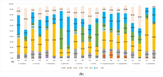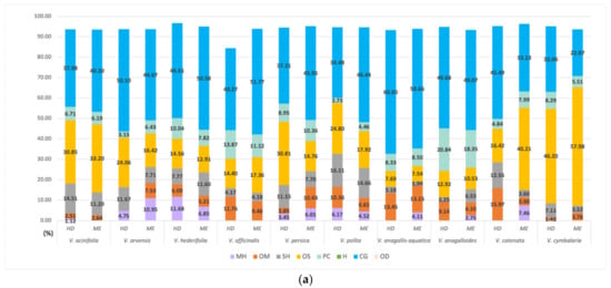 Relative content of hydrosol volatiles in 10 Veronica species divided into eight categories: monoterpene hydrocarbons (MH), oxygenated monoterpenes (OM), sesquiterpene hydrocarbons (SH), oxygenated sesquiterpenes (OS), oxygenated diterpene (OD), phenolic compounds (PD), hydrocarbons (H), and a common group (CG) of acids, alcohols, and esters. (a) categories for hydrosols from HD and MAE; (b) categories for LLs from HD and MAE.