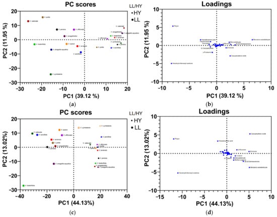PCA analyses of volatile compounds of 10 Veronica species – hydrodistillation (HD) and microwave-assisted extraction (MAE). (a) PCA score plot for LLs and hydrosols (HY) from HD method; (b) PCA loading plots of volatiles from the first and second principal component for the LLs and hydrosols from HD method; (c) PCA score plot for LLs and hydrosols from MAE method; (d) PCA loading plots of volatiles from the first and second principal component for the LLs and hydrosols from the MAE method.