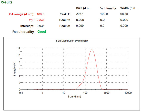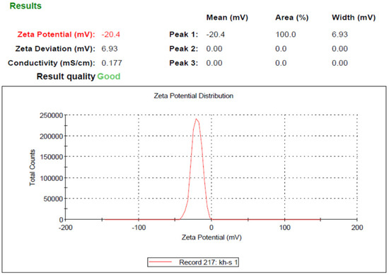 Based on the results obtained from DLS analysis, the nanoparticle size was estimated as 206 nm and the particle size distribution as 0.231, which indicates the uniformity of particle size (Figure 2). Additionally, the hydrodynamic diameter obtained by the DLS method is near the size obtained by the FE-SEM method. The zeta potential of SeN was −20.4, shown in Figure 3.