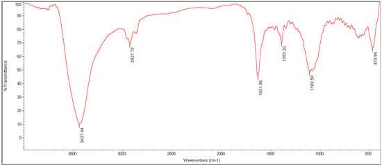 The results of FTIR are shown in Figure 4. As can be seen, the peak specified in 1105 cm−1 is related to Se–O tensile vibrations, and the peak in 1613 and 470 cm−1 is related to Se–O bending vibrations. High-intensity bands are observed in 3437 cm−1, and 11,631 cm−1, which are related to O–H tensile and bending vibrations, respectively, and the peak in 1380 cm−1 refers to C–O tensile vibration. The vibrations observed in 2870 cm−1 and 2927 cm−1 are related to C–H’s symmetric and asymmetric tensile vibrations.