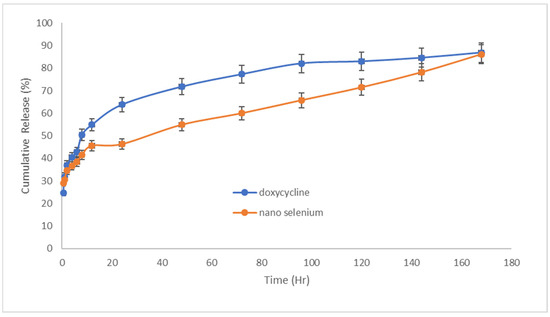 The results of drug release from patches can be seen in Figure 5. It was seen that the amount of doxycycline released from the patch in the first 24 h was 63% and the amount of SeN released was 46% during this period, which represents the initial explosive dose of the drugs released. Drug release was studied for up to 7 days. According to the doxycycline release diagram from the patch, it was significantly higher than SeN, which could be related to the particle size of SeN compared to the molecular size of doxycycline. Additionally, both drugs were finally released at 86.4% and 86.2%, doxycycline and SeN, respectively, indicating the patch’s disintegration and the release of all drug content.