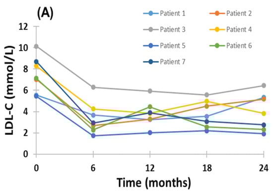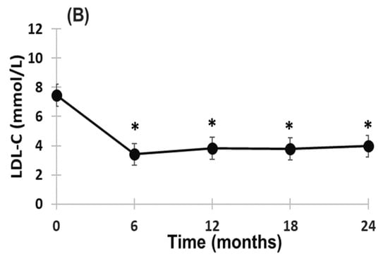 Change in plasma LDL-C concentration during 24-month treatment with evinacumab and LA in HoFH patients; individual (A) and mean (B) responses of patients. Mean ± SEM * p < 0.001 compared to baseline. No significant difference in plasma LDL-C concentration at 6, 12, 18 and 24 months.