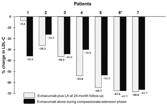 Percentage change from baseline in LDLC at 24-month follow-up (evinacumab plus LA) and during the compassionate extension phase follow-up (evinacumab alone) for individual patients. * Patient 6 received evinacumab treatment only during 24-month follow-up and the compassionate extension phase.