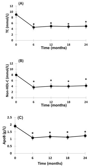 Change from baseline in TC (A), non-HDL-C (B) and apoB (C) during 24-month treatment with evinacumab and LA. Mean ± SEM. * p < 0.001 compared to baseline; No significant difference in plasma TC, non-HDL-C and apoB concentrations at 6, 12, 18 and 24 months.