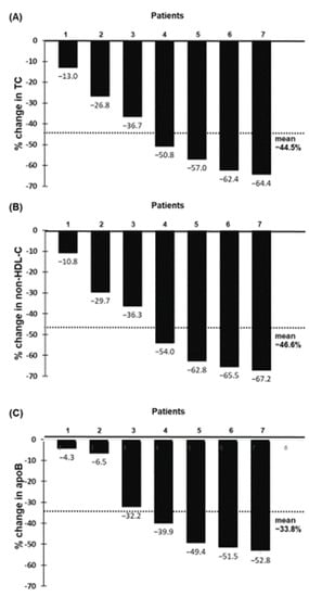 Percentage change from baseline in total cholesterol (A), non-HDL-cholesterol (B) and apoB (C) at 24-month follow-up for individual patients.