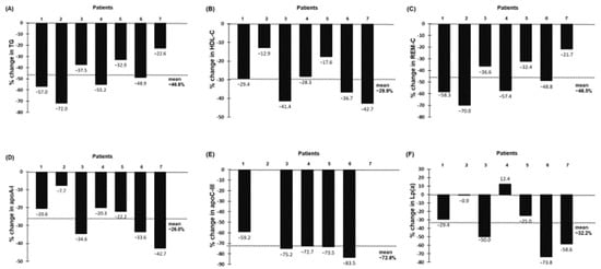 Percentage change from baseline in TG (A), HDL-C (B), REM-C (C), apoA-I (D), apoC-III (E) and Lp(a) (F) at 24-month follow-up for individual patient. Baseline apoC-III data were not available in 2 HoFH (patients 2 and 7).