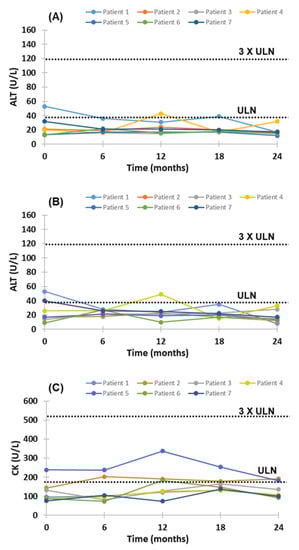 Evinacumab treatment was generally well-tolerated; none led to evinacumab discontinuation owing to severe adverse effects. There was no cardiovascular event observed during the 24-month follow-up and subsequent compassionate extension period (12 months) with evinacumab. Injection-site reactions were not reported. None of the patients reported any symptoms related to the more common adverse effects (pharyngitis, nasal congestion, myalgia, diarrhea and arthralgia) reported elsewhere. Overall, plasma aspartate transaminase (AST), alanine transaminase (ALT) and creatine kinase (CK) concentrations for individual HoFH patients remained stable with treatment with evinacumab, the corresponding liver and enzyme concentrations not exceeding three times the upper limit of normal (ULN) (Figure 6).