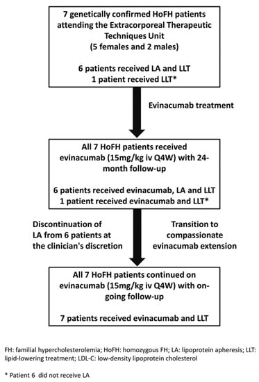 This study was conducted in patients with genetically confirmed HoFH. It provided a long-term follow-up period of 24 months to assess the efficacy and safety profile of evinacumab in real-world clinical practice. We also compared the effect of evinacumab with and without background LA on plasma LDL-C concentration.