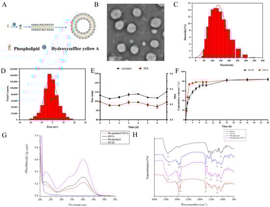 The thin-film hydration method was used to prepare HYAP. HSYA powder and soybean lecithin were placed in a round-bottomed flask at a mass ratio of 1:3, ethanol was used as the solvent, and the mass concentration of HSYA was adjusted to 2 mg/kg. The samples were placed on a constant temperature magnetic stirrer and incubated at 40 °C for 2 h. After the reaction was complete, the unreacted precipitate was removed by suction filtration, and the organic solvent was removed by rotary evaporation under reduced pressure at 45 °C. An appropriate amount of chloroform and cholesterol (the mass ratio of phospholipid and cholesterol was 5:1) was added, shaken slightly to dissolve it, and any insoluble precipitates were removed via filtration. Continued rotary evaporation under reduced pressure at 45 °C formed a phytosome film on the bottom of the bottle. An appropriate amount of the saline was added to hydrate the phospholipid film for 30 min at 60 °C, followed by sonication for 15 min in a bath sonicator at 42 kHz and 100 W. The resulting phytosomes were subsequently extruded 10 times through a 100 nm polycarbonate porous membrane using an extruder (Avestin, Ottawa, ON, Canada).