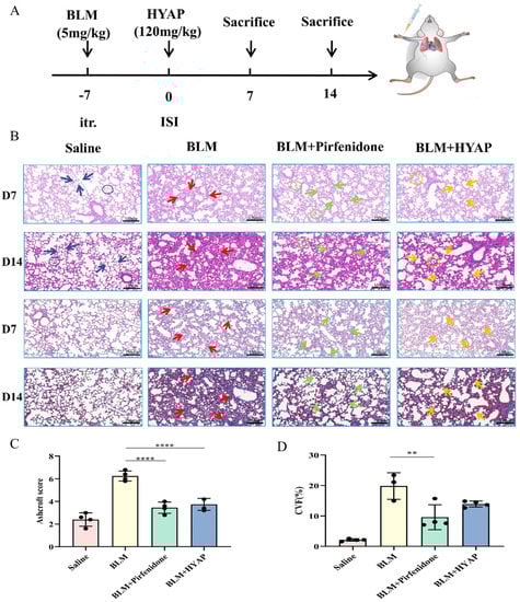 The CO2 asphyxiation method was adopted to execute the animal, whereby the animal was placed into the euthanasia box and CO2 was infused into the box at a rate of 20% of the volume of the box per minute replacement. It was confirmed that the animal was not moving and not breathing, the CO2 was turned off after the pupils were dilated, and then the animal was observed for 2 min to ensure that it was dead. Then, the left lower lung tissues were collected from each group on days 7 and 14 after administration and then fixed in 4% paraformaldehyde for 72 h. The samples were subsequently dehydrated using a series of gradients of ethanol, made transparent with xylene, and then embedded in paraffin. The samples were then cut into thin slices using an automated microtome, mounted on slides, and stored at room temperature for hematoxylin and eosin (HE) and Masson trichrome staining. After dewaxing, hydration, staining, dehydration, and sealing, pathological analysis was performed. Semi-quantitative analysis of pulmonary fibrosis was performed with reference to the Ashcroft scoring criteria, and the collagen volume fraction of Masson trichrome staining was calculated for different groups using Image J software.