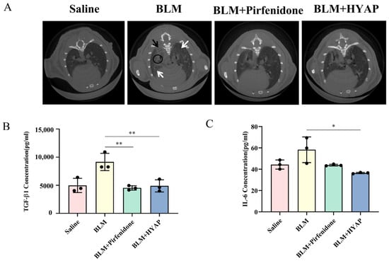 On day 14 of administration, mice were randomly selected from the saline, BLM, BLM + pirfenidone, and BLM + HYAP groups, and changes in lung structure during the establishment of fibrosis and drug treatment were recorded using CT in vivo imaging. CT was preheated for 15 min. The setting parameters were as follows: voltage, 90 kV; imaging current, 180 µA; real-time observation current, 180 µA; FOV, 24 mm; scanning program, 4.5 min; scanning angle, 360. The anesthesia machine was connected to an oxygen bottle, isoflurane was added, the gas source valve was adjusted at the front end of the oxygen flowmeter so that the output gas reached the required flow rate (300 mL/min), and the mice were placed in the anesthesia box. The anesthetized mice were fixed on the instrument cavity operating table, and the chamber was closed for scanning and analysis of the structure.