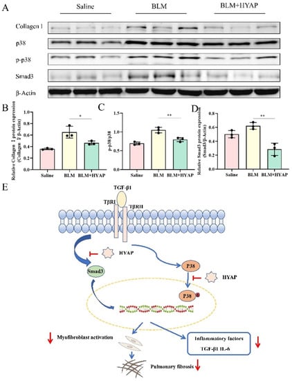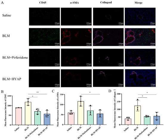 28]. In the present study, using immunofluorescence, we confirmed the strong upregulation of α-SMA expression in the BLM group, whereas the expression levels of α-SMA in lung tissue decreased significantly in the BLM + HYAP group, suggesting that the proliferation and differentiation of fibroblasts were significantly inhibited by treatment with HYAP via ISI.