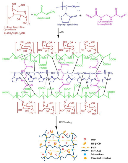 Acrylic acid (AA), poly(vinyl pyrrolidone) K30 (PVP), and ammonium persulphate (APS) were procured from Daejung chemicals & metals Co, Ltd., Nakdong-daero, Sasang-gu, Busan, Korea. Hydroxylpropyl β cyclodextrin (HP-β-CD) was received from Roquette France as a gift sample. Ethanol and N, as well as N-methylene-bis-acrylamide (MBA) were acquired from Merck and Alfa Aesar, respectively. Remington Pharmaceutical Lahore, Pakistan gifted the dexamethasone sodium phosphate (DSP). The rest of the reagents employed were of analytical grade and used as received.
