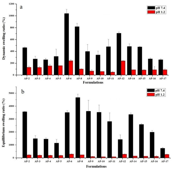 Effect of pH on dynamic swelling ratio (%) at 8 h (a) and equilibrium swelling ratio (%) (b) of semi-IPN hydrogels. Error bars show standard deviation (n = 3). No gel was formed in AP-1, AP-7, and AP-13.