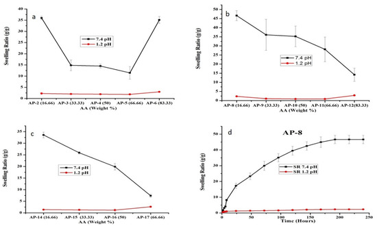 Influence of AA concentration on the equilibrium swelling ratio (g/g) at pH values of 1.2 and 7.4. HP-β-CD concentration remained constant at various concentrations of PVP, i.e., (a) 0.3 g, (b) 1.33 g, (c) 2.66 g. (d) Swelling ratio of AP-8 at pH values of 1.2 and 7.4. Here, error bars demonstrate standard deviation (n = 3).