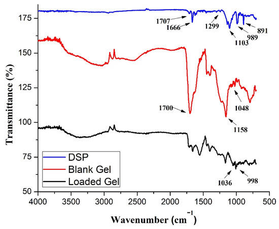 FTIR is an easy-to-use, fast, sensitive, and nondestructive analytical technique for pharmaceutical analysis and quality control. It is equally helpful in the identification of functional groups in polymers, plastics, resins, etc. Therefore, we can use this technique for all phases of the pharmaceutical product lifecycle, i.e., design, manufacture, quality control, and failure analysis. In the current research, we employed this technique to confirm the structure of semi-IPN hydrogels and rule out any possible interaction between the loaded drug and hydrogel components. For this purpose, we analyzed the FTIR spectra of DSP, blank, and DSP-loaded semi-IPN hydrogels (Figure 5).