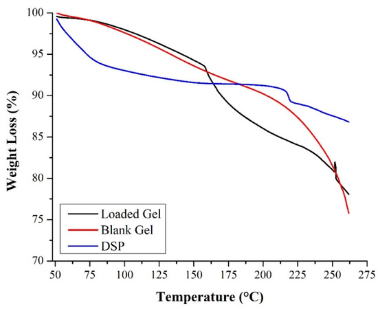Thermogravimetric analysis of DSP, blank, and DSP-loaded semi-IPN hydrogel matrices (AP-8).