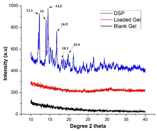 XRD is employed during new drug development, manufacturing, and quality control of various dosage forms. It is a fast, nondestructive technique that provides valuable information on polymorphism, crystallinity, and amorphicity of drug molecules in solid dosage forms including semi-IPN networks. As the majority of active ingredients are often obtained as crystalline powders, scientists can use these patterns as a readily obtainable fingerprint to determine the structural type. Figure 7 shows characteristics of diffraction peaks of DSP at 12.1°, 14°, 14.5°, 16.9°, 18.1°, and 19.9°, which indicates its crystalline structure [37]. Poly(AA) is amorphous in nature [60], while the amorphous nature of HP-β-CD was shown by two broad peaks from 5–15° and 15–25° (2θ) [51,61].