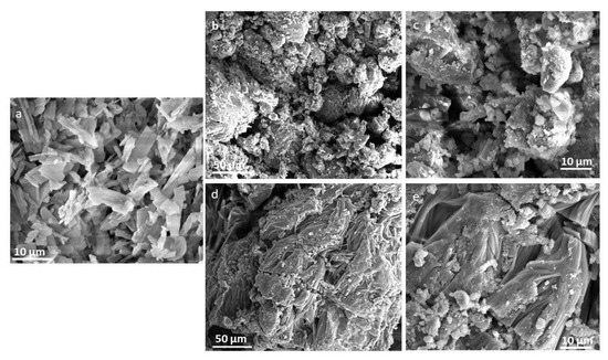 SEM of (a) pure drug, (b,c) blank, and (d,e) DSP-loaded hydrogel (AP-8).