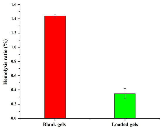 Hemocompatibility test was used to assess the compatibility of the hydrogels with the biological system [68]. Hydrogels with HR above 5% are regarded as hemolytic, between 5 and 2% as slightly hemolytic, and less than 2% as non-hemolytic [69,70]. HR induced by blank and drug-loaded semi-IPN hydrogels was below 2% as shown in Figure 10. Therefore, AP-8 can be considered as non-hemolytic and can be safely used as a carrier for colon targeting. Our results are in agreement with the previously reported findings of Ghosh et al. [70], where the HR of prepared semi-IPN hydrogels of carboxy methyl guar gum and gelatin was less than 2%.