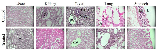Histopathological images of vital organs of control and group treated with hydrogel after H&E staining. Here, trinocular microscope (Accu-Scope 3001) with a built-in five megapixel camera was used to take images at 40×. Alphabets in micrographs are designated as “C” for cardiomyocytes of heart, “G” for glomerulus of kidney, “CV” for central vein of liver, “PV” for portal venule, “PA” for portal arteriole, “BD” for bile duct, “A” for alveolar sacs of lung, “L” for lumen, and “M” for mucosa of stomach.