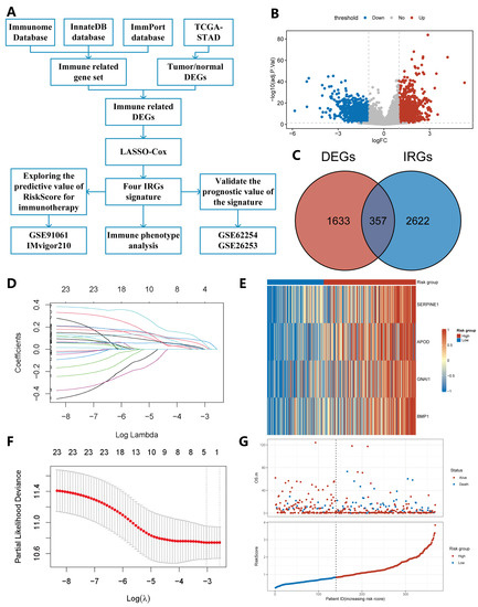 Figure 1. Flow chart of the study design and construction of the IRS. (A) Flow chart of our study. (B) DEGs in GC vs. adjacent normal tissues. (C) These DEGs were intersected with a combined IRGs set. (D) LASSO coefficient profiles of genes in TCGA-STAD. (E) Heatmap of the risk score consisting of four IRGs. (F) Selecting the best parameters by ten-fold cross-validation in the LASSO model. (G) Distribution of risk score, survival time, and status of patients in TCGA-STAD cohort.