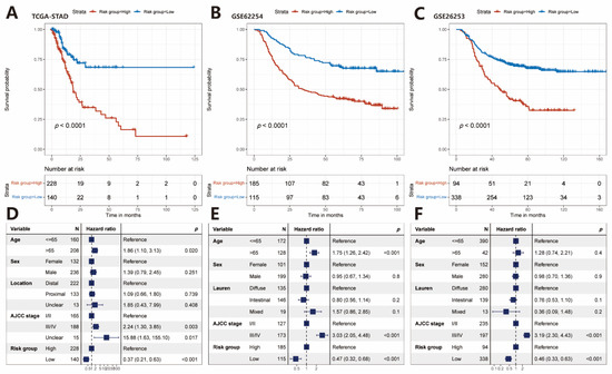 Figure 2. Relationship between risk score and patients’ survival in different cohorts of GC patients. K–M curves of OS according to risk groups in the TCGA-STAD discovery cohort (A), GSE62254 validation cohort (B), and GSE26253 validation cohort (C). Forest plot of multivariate regression analyses showing the association between risk score and patients’ survival in the three cohorts (DF).