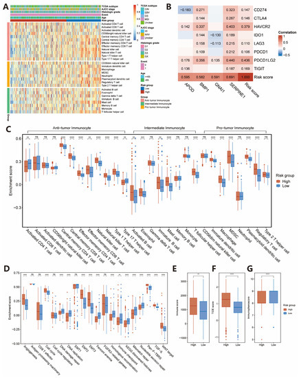Figure 3. Transcriptome traits and clinical characteristics of TME phenotypes in the TCGA-STAD cohort. (A) ssGSEA identified the relative infiltration of 28 tumor-infiltrating immune cell types with different risk groups in the TCGA-STAD cohort. (B) Correlation matrix of risk score, four IRGs and seven immune-checkpoint-relevant genes (Spearman test, p < 0.05). (C,D) The relationship between risk score and 28 tumor-infiltrating immune cell types or pathways using ssGSEA. (EG) Comparison of Immune, TIDE scores, and IPS between high- and low-risk groups in TCGA-STAD cohort. Wilcoxon test, ** p < 0.01; *** p < 0.001; **** p < 0.0001; ns, not statistically significant.