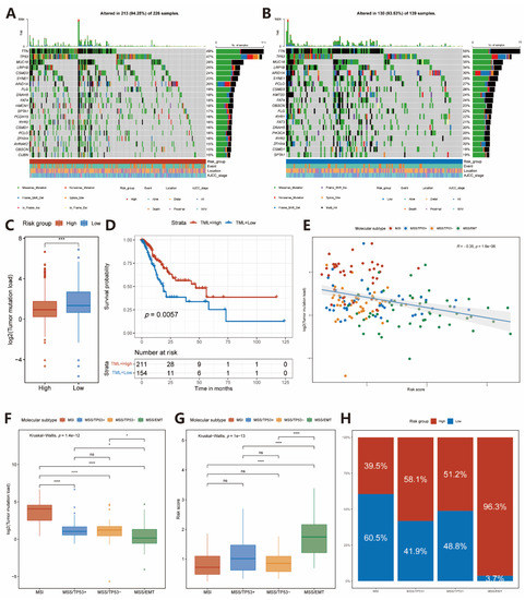 Figure 4. Comparison of tumor mutations between high- and low-risk groups. (A,B) The oncoPrint of high- and low-risk groups in the TCGA-STAD cohort. (C) TML difference in the high- and low-risk groups. Wilcoxon test, *** p < 0.001. (D) Kaplan–Meier curves for high- and low-TML groups of the TCGA-STAD cohort. Log-rank test, p = 0.011. (E) The relationship between risk score and TML in TCGA-STAD cohort (Spearman test, p < 0.0001). The dotted color indicates the ACRG molecular subtypes of GC. (F) TML difference in different ACRG molecular subtypes of the TCGA-STAD cohort. Steel–Dwass test, * p < 0.05; *** p < 0.001; ns, not statistically significant. (G,H) Distribution of the risk score and percentage of the high-risk group in different ACRG molecular subtypes of the TCGA-STAD cohort. Steel–Dwass test, **** p < 0.0001; ns, not statistically significant.