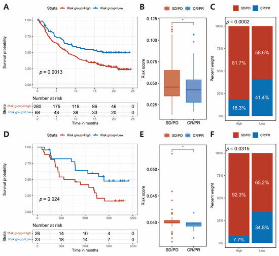Figure 5. Response to immunotherapy in patients of urothelial cancer and melanoma with different risk groups divided by risk score. (A) K–M curve for patients of urothelial cancer in the high- and low-risk groups in the IMvigor210 cohort. Log-rank test, p = 0.0013. (B) Risk score in groups with a different clinical response to immunotherapy in the IMvigor210 cohort. Wilcoxon test, * p < 0.05. (C) The proportion of patients with a response to immunotherapy in high- and low-risk groups in the IMvigor210 cohort. Pearson’s Chi-squared test, p = 0.0002. (D) K–M curve for patients of melanoma in the high- and low-risk groups in the GSE91061 cohort (Log-rank test, p = 0.024). (E) Risk score in groups with a different clinical response to immunotherapy in the GSE91061 cohort. Wilcoxon test, * p < 0.05. (F) The proportion of patients with response to ICIs therapy in high- and low-risk groups in the GSE91061 cohort. Fisher’s exact test, p = 0.0315.