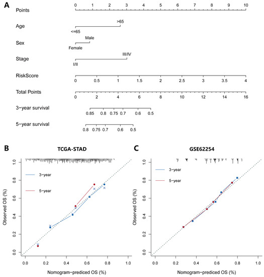 We built a nomogram combining risk score and independent clinical prognostic factors including age, sex, and AJCC stage, to predict the probability of 3-year and 5-year OS in the TCGA-STAD cohort (Figure 6A). The calibration curve illustrated that the predictions and actual observations matched well (Figure 6B). Furthermore, the nomogram was validated in the GSE62254 and GSE26253 gastric cancer datasets, and the 3-year and 5-year calibration curves are respectively shown in Figure 6C and Figure S5C.