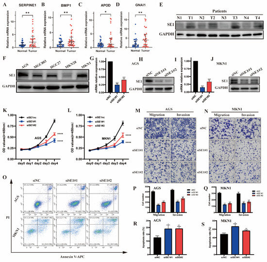 Figure 7. SERPINE1 promotes the malignant biological behaviors of GC cells. SERPINE1 (A), APOD (B), GANI1 (C) and BMP1 (D) mRNA and SERPINE1 (E) protein levels were measured in GC tissues, and adjacent normal tissues were paired by qPCR and Western blotting, respectively. Western blotting analyses of SERPINE1 protein levels in GC cell lines (F). Western blot and qPCR analyses of SERPINE1 levels in GC cell lines transfected with the siSERPINE1 (GJ). CCK8 assay of cell growth with SERPINE1 silencing and control group (K,L). Representative images and quantification of migration and invasion in SERPINE1 silencing and control GC cell lines (M,N,P,Q). Apoptosis assay and the quantitative analysis of SERPINE1 in silencing and control group (O,R,S). Data were presented as the mean ± SD. Wilcoxon test, * p < 0.05; ** p < 0.01; **** p < 0.0001.