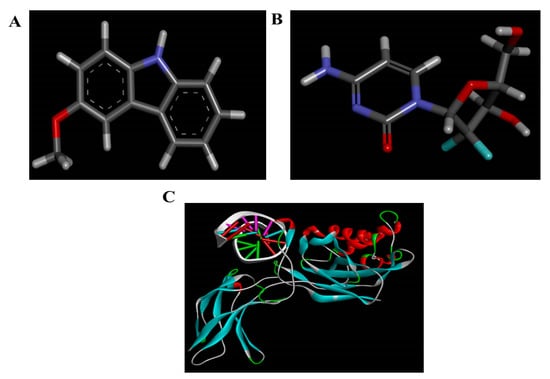 Three-dimensional structures of 3-Methoxy carbazole (MHC) were downloaded from the PubChem database. These compounds were docked to the NF-κB precursor protein p105, to predict the mechanism of breast cancer cell suppression. In this study, the commercial anticancer drug, gemcitabine, was selected as a reference compound (Figure 1A–C).