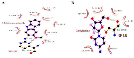 Ligplots showing the molecular interaction of the NF-κB precursor p105 with (A) 3-Methoxy carbazole and (B) Gemcitabine.