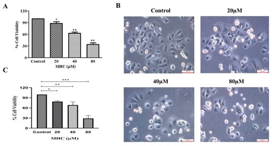 To investigate the plausible cytotoxicity of MHC on MCF-7 cells, an MTT assay was performed after treating MCF-7 cells with different concentrations of 20, 40 and 80 µM for 24 h. The results indicated that the MHC significantly impeded the growth of the MCF-7 cells by 88.40 ± 3.50% (20 µM; p < 0.05), 62.88 ± 2.77% (40 µM; p < 0.01), and 34.08 ± 3.73% (80 µM; p < 0.001), in a dose-dependent manner (Figure 3A). Furthermore, a morphological analysis of the MCF-7 cells upon the treatment with MHC was evaluated through phase-contrast microscopy. As illustrated in Figure 3B, the photomicrographs positively indicated towards the shrinkage, swelling and rupturing of the MCF-7 cells; thereby, confirming the dose-dependent cytotoxic effect of MHC on breast cancer cells. Furthermore, the MHC exhibited its competence in exerting substantial cytotoxic effects on MDA-MB-231 cells. The observations from the MTT assay elucidated that the MHC restricted the growth of the MDA-MB-231 cells by 85.33 ± 4.02 (p < 0.05), 68.71 ± 4.46 (p < 0.01) and 32.19 ± 3.69 (p < 0.001) at concentrations of 20 µM, 40 µM and 80 µM, respectively (Figure 3C).