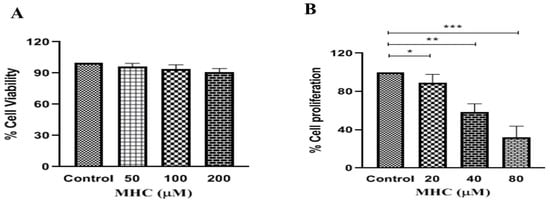 (A) MHC-mediated non-cytotoxic effects against human-lung WI38 cells post-MHC treatment after 24 h and (B) the effect of MHC in impeding the proliferation of MCF-7 cells as per the observations of the BrdU assay. * p < 0.05, ** p < 0.01 and *** p < 0.001.