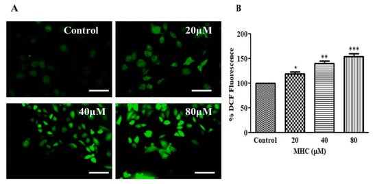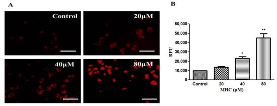 The intracellular estimation of the ROS was quantified using a DCF-DA stain through a spectrophotometer as reported previously []. A total of 1 × 104 MCF-7 cells were incubated overnight for adherence in each well of a 96-well plate under the optimum culture conditions. The cells were then subjected to 20, 40 and 80 µM of MHC for 12 h. Subsequently, the cells were exposed to 10 mM of DCFH-DA at 37 °C for additional 30 min in the dark. Finally, the DCF-DA-mediated fluorescence intensity (excitation:emission = 458/528 nm) was quantified using a microplate reader (BioTek, Winooski, VT, USA).